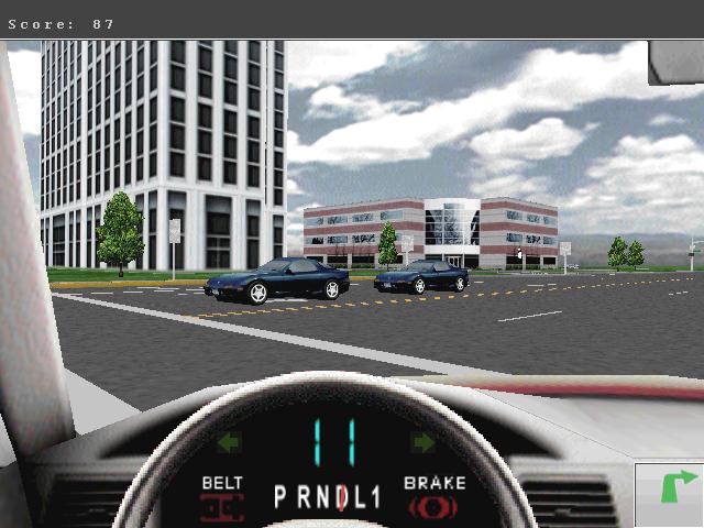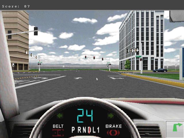 Playing Driver's Education is very much like a real driving school experience except for the virtual cars. You go through lessons in order, each of which is followed by a 3D driving lesson with driving teacher named "Ed" as your (very talkative) passenger, who gives you both lessons and encouragement you drive in the virtual city. While behind the wheel, you will lose points both for breaking the rules and not taking enough safety precautions. Point-losing events include speeding, pulling out into traffic without signalling, and not buckling your seatbelt. After the lessons, you will eventually take a review test. Released for US consumers, the program takes into account laws of different states by offering the lessons and tests that is appropriate to your state (you are asked this information at the beginning).