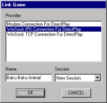 Oh yes, Baku Baku is very much dependent on head to head action, wherein (like virtually all games of this type) the first side to fill to the top with fruit and animal head blocks loses. In one player mode you play against various goofy characters of different "intelligence" levels, but (and this is the really commendable part) Baku Baku also offers two player modem and TCP/IPX network mode, in addition to accommodating two players on the same PC, so that if you find that one other person who bought the game, you can connect to him/her. Baku Baku throws in rendered graphics, some interesting 3D effects (like the way the animal heads chomp the fruit when they connect), and plenty of really goofy sound effects. On the downside, there's no straightforward one player, non-competitive mode, and in the one player arcade mode there isn't a continue option to let you try again on the level you lost at. Also, despite what the box (and even the manual) says, there is no Internet multiplay option, which is a terribly misleading and disappointing oversight.