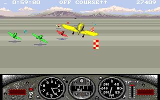 Not surprisingly, hitting objects tends to have an adverse effect on your aircraft. It is certainly possible to survive minor mid air collisions - wing clipping and the like but the tactic is not recommended. Should you be unfortunate enough as to suffer a crash, you parachute gently down to earth - some nice graphics here. The packaging shows you landing in a haystack being watched by a pretty girl but the only places I seem to land are in the middle of a desert, watched by large cacti and the skulls of long dead cattle! If you do crash, you can restart from approximately the same position that you left the race.
