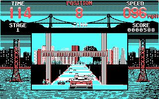 The concept is simple: take a few cops, put them in San Francisco, and let them push the pedal to the metal! You can choose between two cars: the Ford LTD Crown Victoria and the Nissan 300ZX. The problem is that there is no real difference between them. They both have two gears: Low gives you a maximum speed of 96 mph, while High lets you rush to the goal at 196 mph. The road is represented by dark and light horizontal rectangles which scroll down to the bottom of the screen. The surroundings are represented by two-dimensional sprites which scale up and down depending on the distance between you and them. It's far from the "exciting realism" promised in an advertisement, yet the illusion it gives is quite good. The sounds are quite nice, and the controls are simple: the cursor keys are used to turn and accelerate, while the space bar lets you change gears. The obstacles in the game are represented by roadsigns, litter, vehicles, and such; not to mention the off-road areas. All of the obstacles will flip you, wasting vital time. While you have seven foes to defeat, time is your greatest enemy. You usually have just over a minute or two to finish the actual stage (of which there are five), so even if you only flip once or twice, you'll barely finish in time. Only the first three or four drivers continue the race.